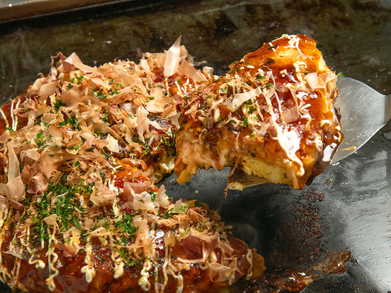 鉄板で丁寧に焼き上げるお好み焼きは、創業当時から大切にしてきた看板メニューです。